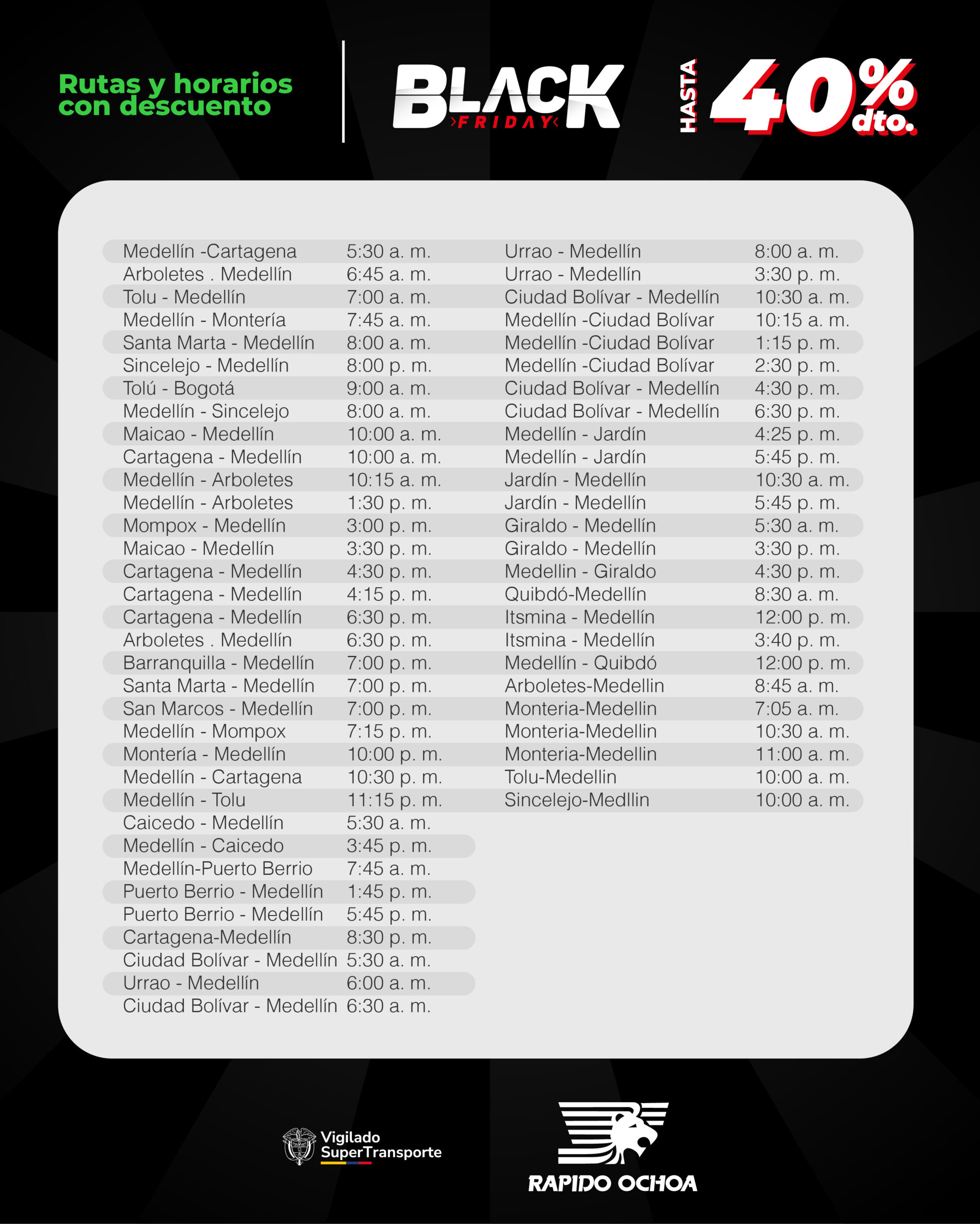 - Si compras para viajar entre 18 al 31 de diciembre 2025 en las rutas con origen costa y destino final Medellín encontrarás descuentos hasta el 40%.